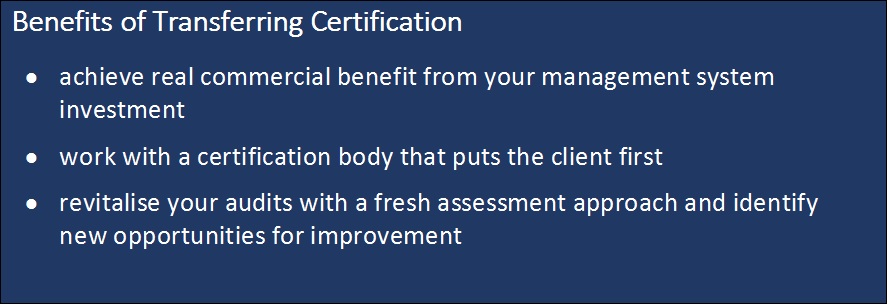 The transfer process does have a few formalities which maintain the integrity of the certification during transfer. We will need a copy of your current certificate of registration and latest audit report(s) going back to your organisation’s last certificate decision.